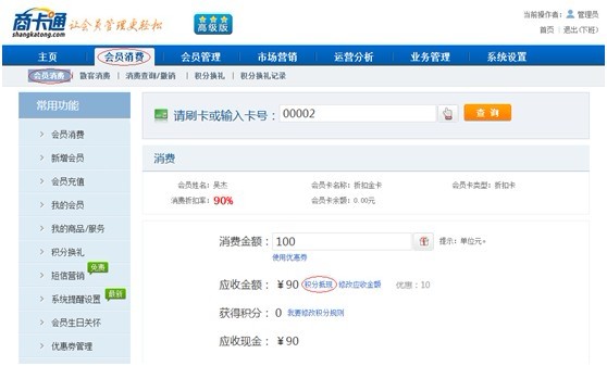 b. 保存好积分抵现规则后,在“会员消费”-“会员消费”功能里即可使用: