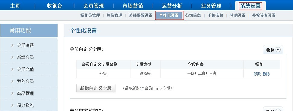 说明运用方法之前,商卡通会员管理软件中设置会员的自定义内容。举例在【系统设置】-【个性化设置】功能新增一个班级自定义字段。商户可以按照自己店铺实际情况新增自定义字段。