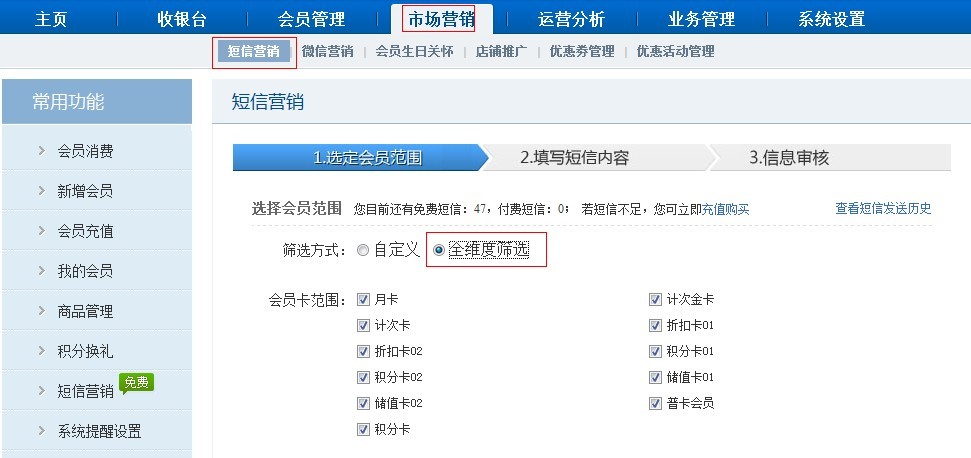 1. 打开【市场营销】-【短信营销】-勾选全维度筛选