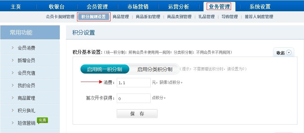 会员积分管理软件【积分规则设置】功能里的消费金额数支持输入小数点。比如设置消费1.1元获得1点积分: