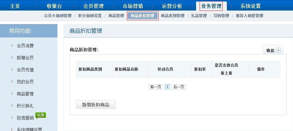 李店长的建议经过商卡通研发部门评估排定,审核结果的是:可以上线,最终安排在2013年7月31号新增了商品不折扣功能,会员系统软件一些特殊的商品不折扣,系统里面设置操作,进入【业务管理】-【商品折扣管理】功能,点击“新增折扣商品”。