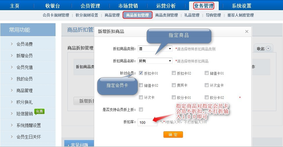 选择指定商品类型下的指定单一商品或者该商品类型的所有商品,再选择指定的会员卡名称。设置不折扣输入100,点击确认在弹出“新增折扣商品成功”窗口即为设置成功。设置成功后,名称为:折扣卡01所属下的会员在消费酒类商品时不打折。