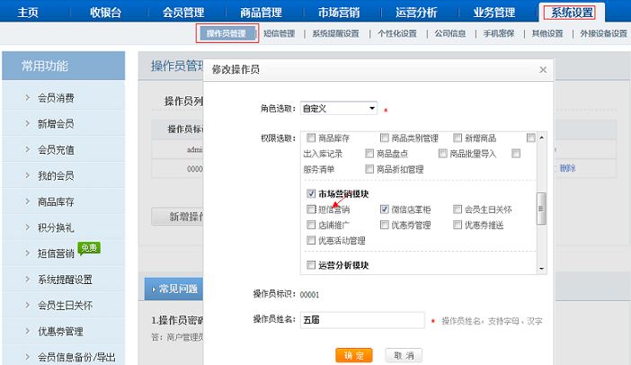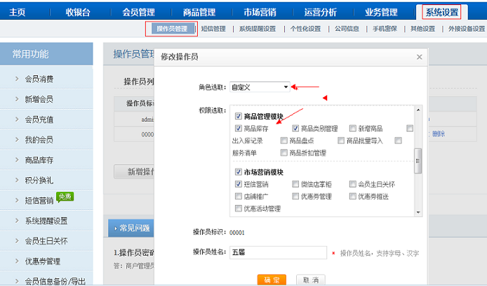 这时,通过管理员( admin )身份登陆软件,给该操作员勾选【新增商品】、【积分规则设置】、【短信营销】三大权限保存即可解决。权限的限制,为了避免操作员店员误操作,给老板更多的权限设置。