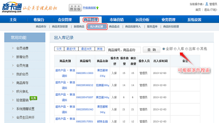登陆商卡通软件,进入【商品管理】 - 【出入库记录】功能,输入商品编号或者商品名称进行查询详细的商品出入库记录。方便商户轻松了解自己的商品库存情况。