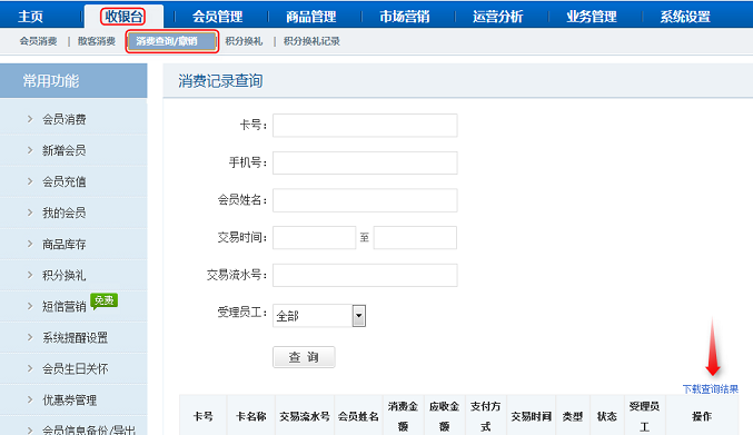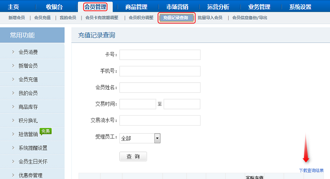 进入【会员管理】 - 【充值记录查询】功能,同理点击“下载查询结果“即可。