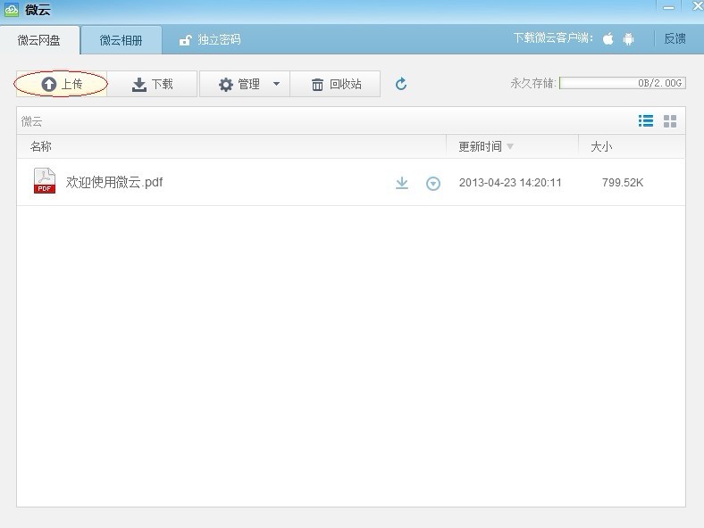 最后一步,进入微云之后,点击“上传”选上会员信息表格进行上传即可:
