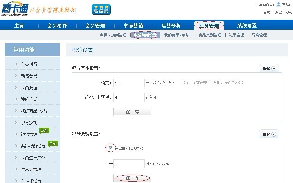 业务管理-积分规则设置功能,输入积分抵现规则,勾选“开启积分抵现功能”。