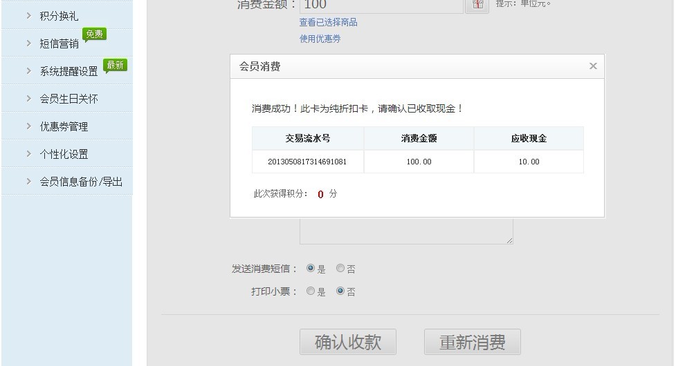显示会员消费成功,完成积分抵现。