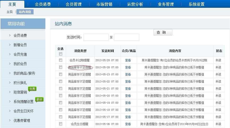 店里没货了,需要进货,经常忘记进货怎么办?不用担心,利用商卡通会员管理软件的“商品库存不足提醒“功能,提前提醒自己进货、备货。