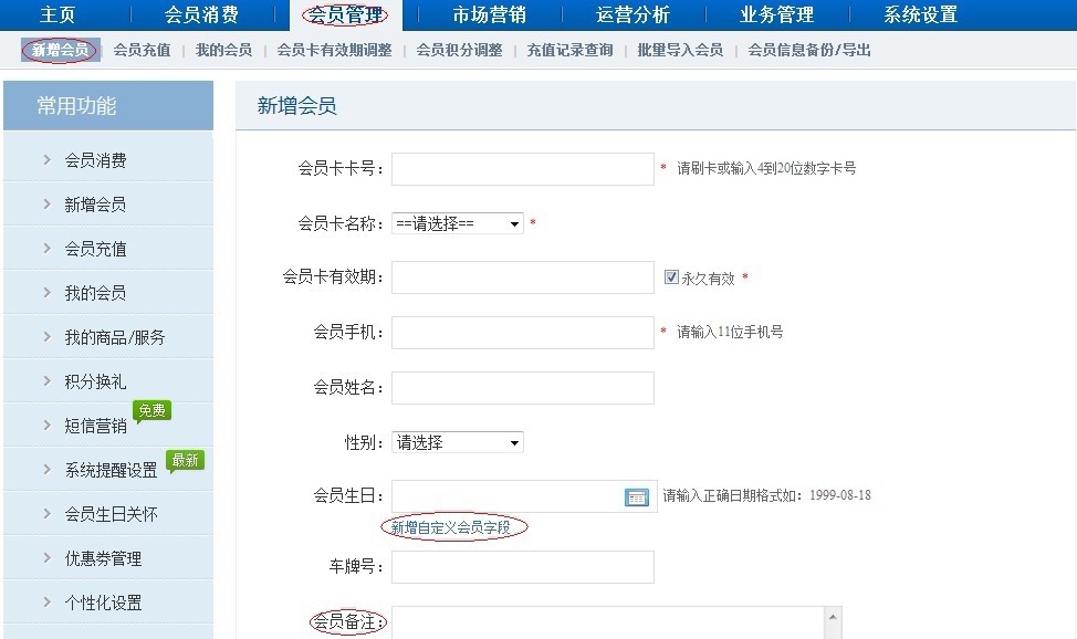 商卡通会员管理软件【会员管理】-【新增会员】支持新增自定义字段跟会员备注。详细记录会员信息,深层次了解会员。