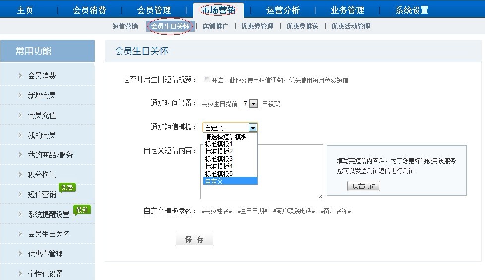 通过商卡通会员管理软件会员“生日关怀功能”,【市场营销】-【会员生日关怀】功能设置好祝福短信点击“保存”,给会员送去祝福。