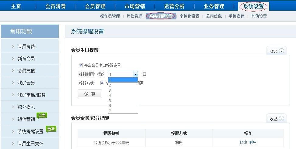 会员生日除了短信祝福外,也可以通过会员生日提醒功能,通过电话祝福。【系统设置】-【系统提醒功能】,提醒信息在【主页】-【站内消息】功能查看。送去商户的关怀,拉近商户与会员间的感情。