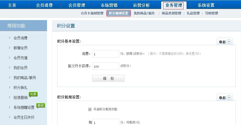 折扣率在新增储值卡时可以进行输入,积分在【积分规则设置】功能里面设置好,消费即可累积积分。