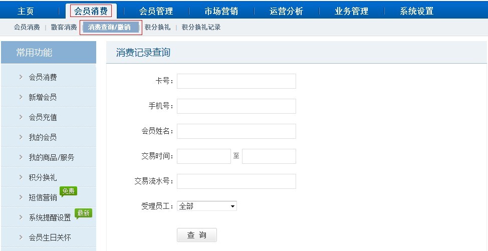 商卡通会员管理软件【消费查询/撤销】功能,除了查询一段时间内的消费订单明细,也可以搜索某个会员的消费,或者小票上的交易流水号,或者按照受理员工作为条件查询消费记录。商卡通会员管理软件针对这块研发的很细微。